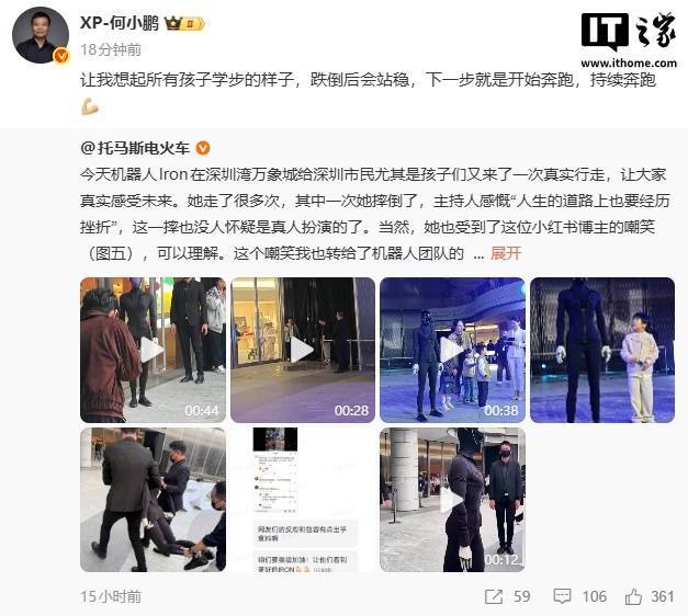 IT之家 2 月 1 日消息,昨日,有网友在社交平台晒出小鹏 IRON 人形机器人摔倒照片,对此,小鹏汽车董事长 @XP-何小鹏 和小鹏汽车副总裁 @托马斯电火车 均进行了回应。